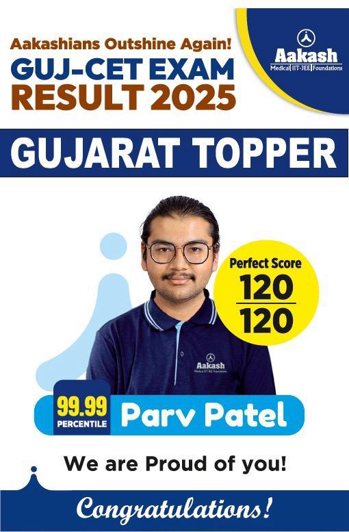 ગુજરાત ૧૦ મે ૨૦૨૫: ટેસ્ટ તૈયારી સેવાઓમાં રાષ્ટ્રીય આગેવાન એવા આકાશ એજ્યુકેશનલ સર્વિસિસ લિમિટેડ (AESL) એ જાહેરાત કરી છે કે GUJ-CET 2025માં પર્વ પટેલે 120 માંથી 120 નો પરફેક્ટ સ્કોર મેળવીને ગુજરાત ટોપર તરીકે ઉભરી આવ્યા છે. તેમણે 99.99 પર્સેન્ટાઇલ પ્રાપ્ત કરી છે, જે તેમના અભૂતપૂર્વ પ્રદર્શનને દર્શાવે છે.