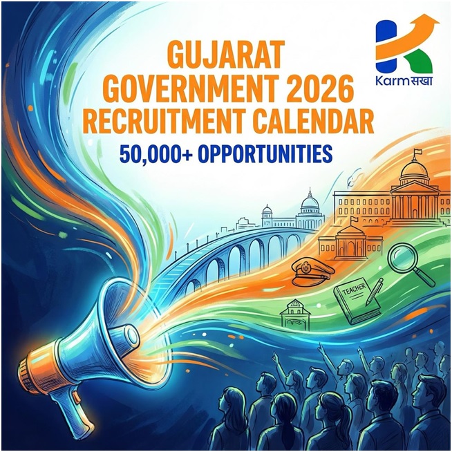સુરત | ૦૮ જાન્યુઆરી ૨૦૨૬ — નવા વર્ષની શરૂઆતમાં ગુજરાતના સરકારી નોકરી માટે તૈયારી કરતા લાખો યુવાનો માટે સારા સમાચાર આવ્યા છે. સુરત સ્થિત કારકિર્દી ટેક્નોલોજી પ્લેટફોર્મ KarmSakha એ 2026ની ભરતીઓનું સંપૂર્ણ કેલેન્ડર જાહેર કર્યું છે, જેમાં પોલીસ, શિક્ષક, ક્લાર્ક અને Class-1 પદો સહિત 50,000થી વધુ જગ્યાઓનો સમાવેશ થાય છે.