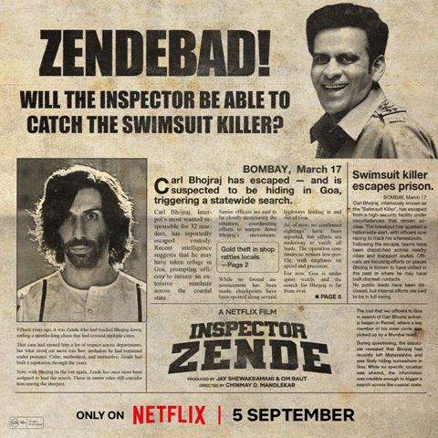 મુંબઈ | ૦૭ ઓગસ્ટ ૨૦૨૫: નેટફ્લિક્સ પર ૫ સપ્ટેમ્બરે રિલીઝ થતી નવી ફિલ્મ ‘ઇન્સ્પેક્ટર ઝેંડે’ એક જુની મુંબઈની કિસ્સાની આધારિત છે. જ્યાં ૭૦-૮૦ના દાયકામાં એક ખતરનાક ગુનેગાર ‘સ્વિમસૂટ કિલર’ તિહાર જેલમાંથી ભાગી જાય છે. ત્યારબાદ એક ઇમાનદાર પોલીસ ઇન્સ્પેક્ટર તેને પકડી પાડવા માટે બધું જૂકી દે છે.