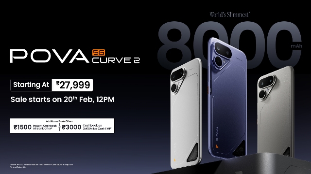 POVA Curve 2 8GB + 128GB માટે ₹27,999 અને 8GB + 256GB માટે ₹29,999 માં ઉપલબ્ધ થશે, જેમાં અગ્રણી બેંક અને NBFC ભાગીદારો તરફથી ₹3,000 સુધીનું કેશબેક મળશે. પ્રી-બુકિંગ 13 ફેબ્રુઆરીથી શરૂ થશે અને 19 ફેબ્રુઆરી સુધી ચાલુ રહેશે. વેચાણ 20 ફેબ્રુઆરીથી ફ્લિપકાર્ટ અને સમગ્ર ભારતમાં અગ્રણી રિટેલ સ્ટોર્સ પર શરૂ થશે.