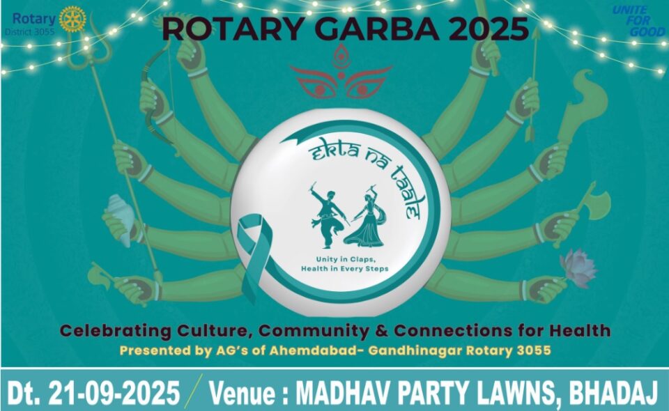 આવા જ એક સામાજીક કાર્યના ઉદ્દેશ્યને પરિપૂર્ણ કરવા માટે રોટરી ડીસ્ટ્રીક્ટના અમદાવાદ – ગાંધીનગરના આસીસટન્ટ ગર્વનર્સ દ્વારા આગામી તા. ૨૧-૦૯-૨૦૨૫ના રોજ માધવ પાર્ટી લોન્સ, ભાડજ, અમદાવાદ ખાતે ‘Unity in Claps, Health in Every Steps’ના ઉમદા અભિગમ સાથે ‘રોટરી ગરબા ૨૦૨૫‘નું આયોજન કરવામાં આવેલ છે. આ ગરબાની તમામ રકમ દિકરીઓ માટે ‘સર્વાઈકલ કેન્સર’ની રસીના ખર્ચ માટે ઉપયોગમાં લેવામાં આવનાર છે.