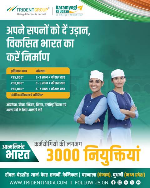 રાષ્ટ્રીય | ૨૬ ફેબ્રુઆરી ૨૦૨૬ — ટ્રાઈડેન્ટ ગ્રુપની મુખ્ય કંપની અને ભારતની અગ્રણી બિઝનેસ ગ્રુપ પૈકીની એક એવી ટ્રાઈડેન્ટ લિમિટેડ દ્વારા તેના મેન્યુફેક્ચરિંગ એકમોમાં 3,000 થી વધુ કર્મયોગીઓની નિમણૂક કરવા માટે એક વ્યાપક ભરતી અભિયાનની જાહેરાત કરવામાં આવી છે. આ ભરતી ઝુંબેશ કાપડ ઉત્પાદન (ટેક્સટાઇલ મેન્યુફેક્ચરિંગ) ક્ષેત્રમાં કૌશલ્ય વિકાસને મજબૂત કરવા અને રોજગાર નિર્માણ વધારવાના રાષ્ટ્રીય એજન્ડાને અનુરૂપ હાથ ધરવામાં આવી રહી છે.