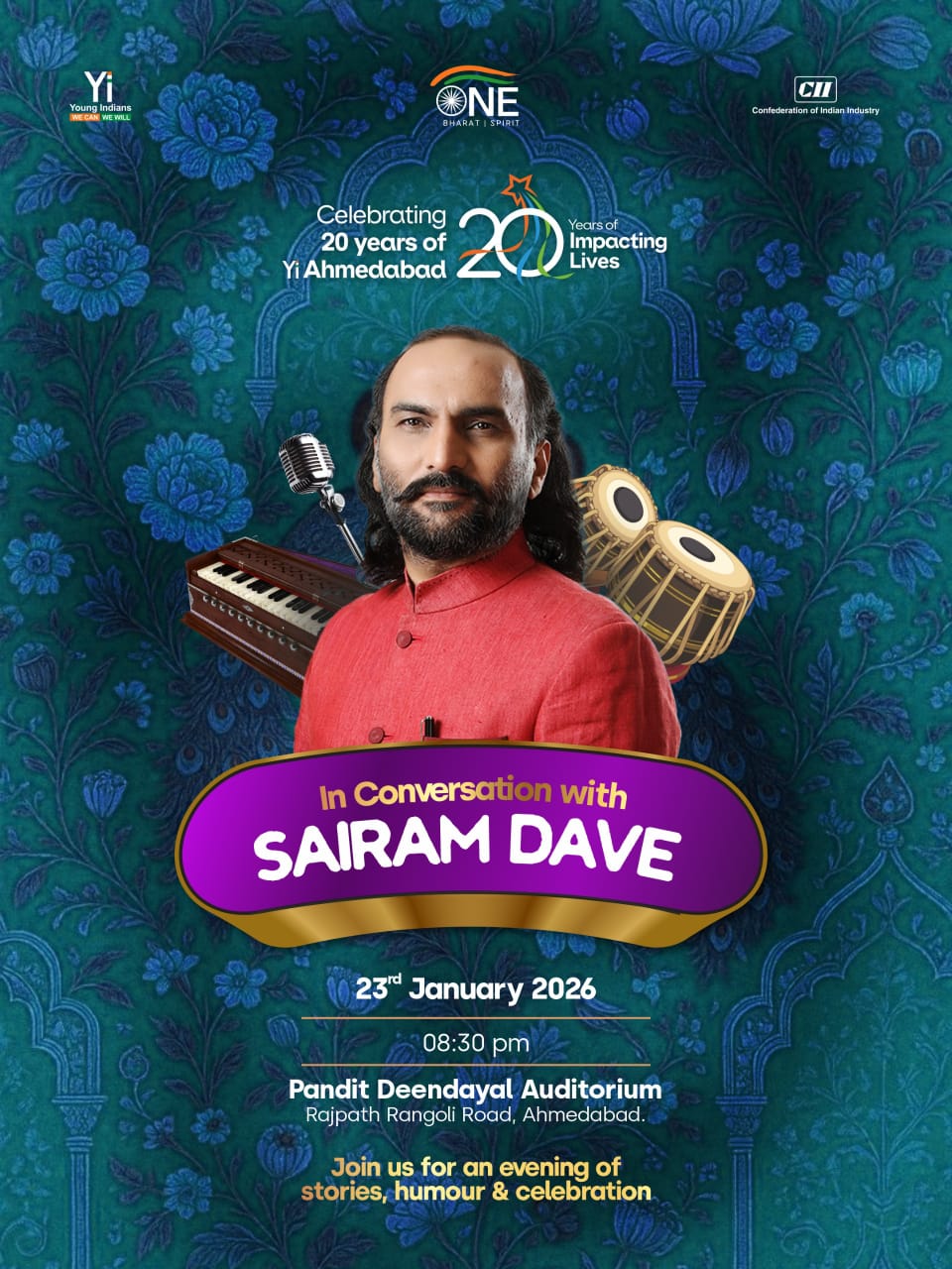 ગુજરાત, અમદાવાદ | ૧૯મી જાન્યુઆરી ૨૦૨૬ — યુવા નેતૃત્વને પ્રોત્સાહન આપવાના બે દાયકાની ઉજવણી તરીકે યંગ ઇન્ડિયન્સ (Yi) અમદાવાદ પ્રસિદ્ધ હાસ્યકાર અને વાર્તાકાર સાંઈરામ દવે સાથે એક વિશેષ સાંજનું આયોજન કરશે. આ કાર્યક્રમ શુક્રવાર, ૨૩ જાન્યુઆરીના રોજ પંડિત દીનદયાળ ઓડિટોરિયમ ખાતે યોજાશે.